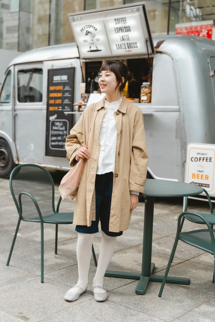 アウターには深みのあるブラウンの《BEAUTY&YOUTH》のコートを選び、全体を落ち着いたトーンで品よく引き締めています。バッグは《ENGINEERED GARMENTS》をセレクト。機能的ながら主張しすぎないデザインが、こだわりのスタイリングにすっと溶け込んでいました。