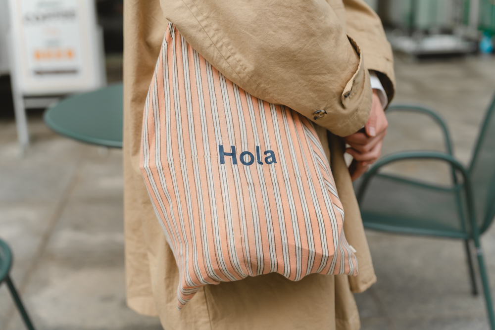 ボトムにはあえてショート丈を合わせることで、全体に程よい抜け感を作っているのはさすが。肩にかけたオレンジのストライプ柄トートは、地元で購入したというお気に入りの一点物。親しみやすさを添えつつ、装いのアクセントとして絶妙なバランスで光ります。