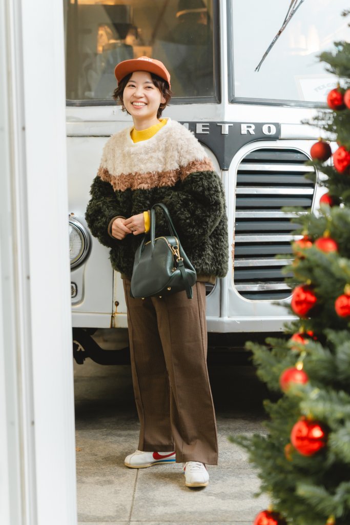主役は《flower&guitar》のふわふわとした毛足が愛らしいニット。白、茶、深緑が並ぶ表情豊かなボーダーは、温もりのある風合いが冬の景色に優しく馴染みます。その首元から《fig London》のイエローセーターをちらりと覗かせ、ニットの緑と掛け合わせることで、さりげなくクリスマスツリーをイメージした遊び心をプラス。ボトムも《fig London》をセレクトし、全体に統一感を持たせつつ、すっきりとした縦のラインを作っています。