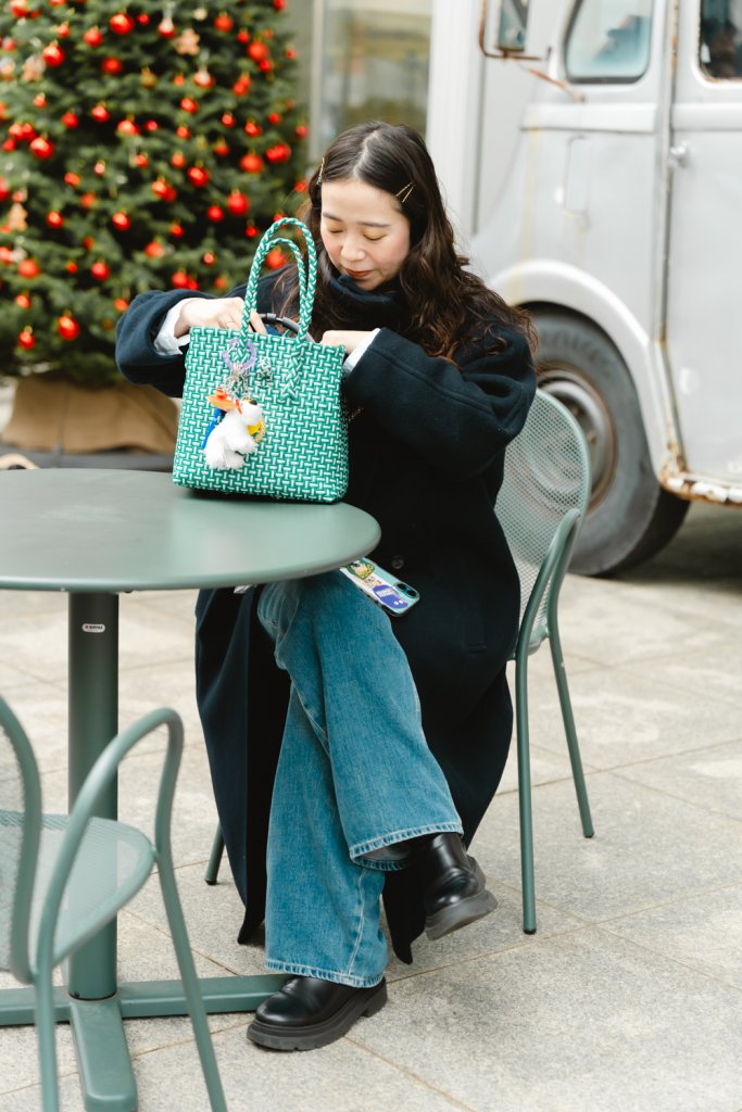 また、《MEKEARISA》の手編みバッグには『タンタン』の相棒・スノーウィや『紅の豚』のチャームが揺れ、彼女の豊かな趣味を覗かせます。もともとアニメやドラマ、映画が好きで、そこからファッションのインスピレーションを受けることも多いのだそう。