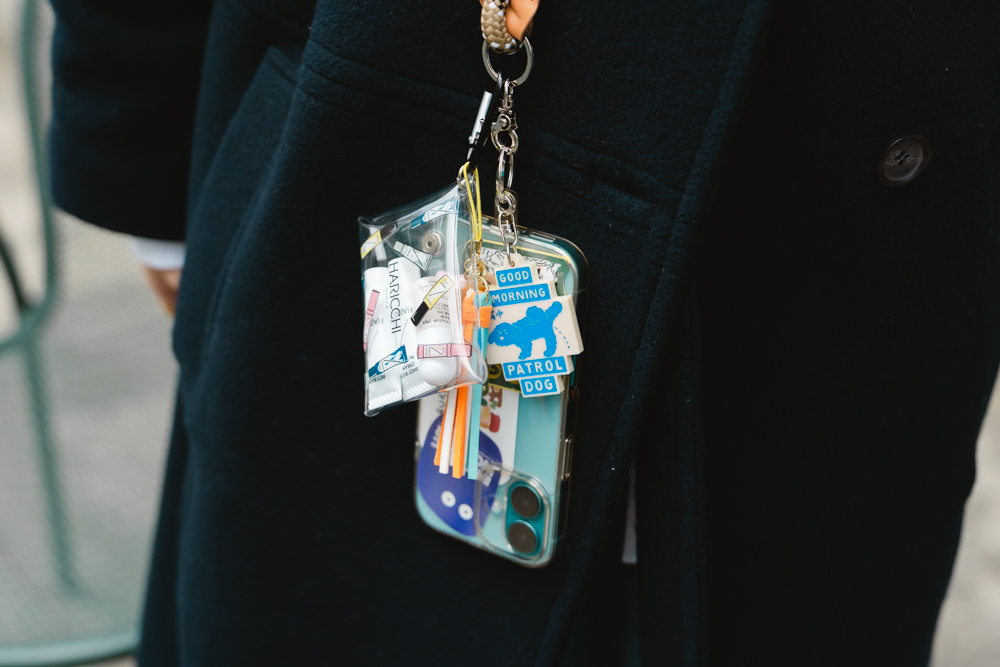 肩からかけた《Beaure》のチェーンには、蚤の市で見つけたアンティークチャームや、《HARICCI》のクリアケースが。ケースの中にレチノールや美容液のミニボトルを忍ばせるユニークなアイデアには、日常を楽しむセンスが溢れています。