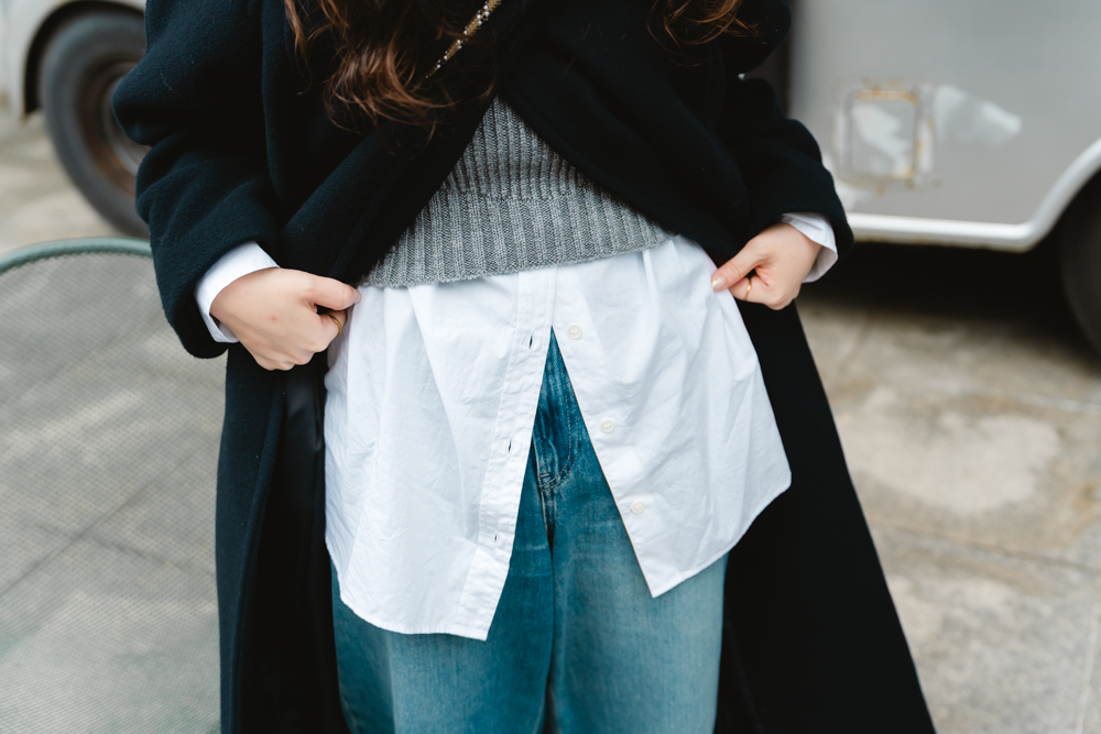 シャツの上に重ねたのは、《Plage》のグレーのニットビスチェ。このひと工夫で、端正なシャツスタイルに柔らかなニュアンスが加わり、全体にメリハリのあるバランスに。仕上げに《SLOBE IENA》のシックな黒のロングコートを合わせて、全体のシルエットをスマートに引き締めています。