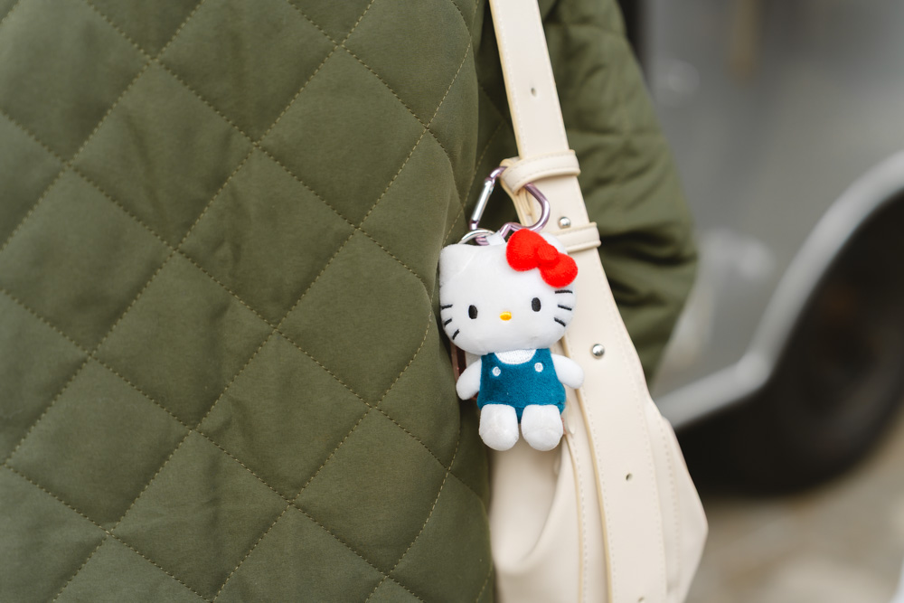 全体は落ち着いたトーンでまとめつつ、《スタイルミキサー》の白のレザーバッグで軽やかなアクセントを。そこに添えられたキティちゃんのマスコットが、きゅんとする遊び心をプラスしていました。「UMIちゃんに会いたくて来ました!」ときらきらとした笑顔とともに、冬のおしゃれを存分に楽しむムードが伝わってきました。