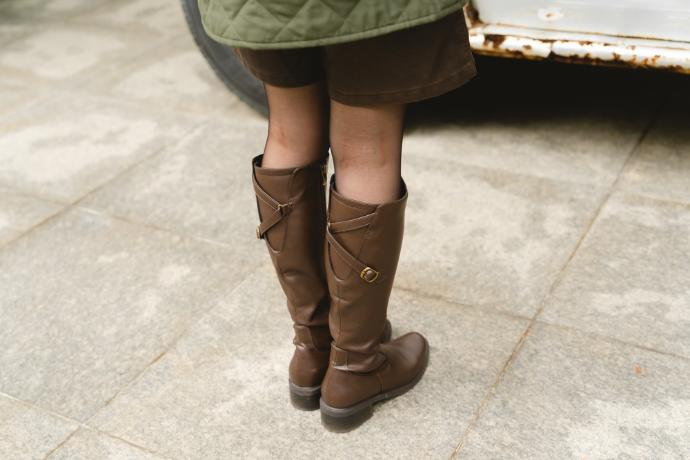 インナーには《ユニクロ》のボーダーニットをセレクト。アウターの隙間から覗くラインが、コーディネートに軽やかなリズムを生み出しています。ボトムはレザーのショートパンツに、《ABCマート》のロングブーツを合わせ、素材のコントラストで奥行きをプラス。ジャケット、ショートパンツ、ブーツの丈感バランスも絶妙で、すらりとしたスタイルをより引き立てています。