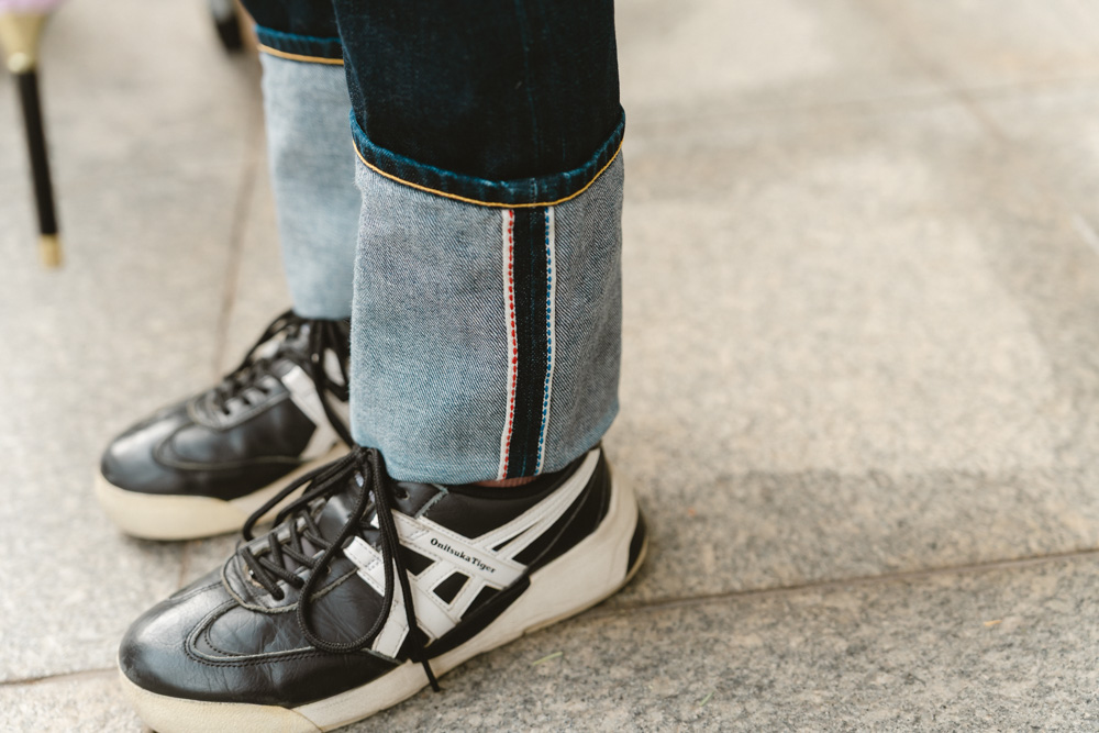 この日のコーデは「クリスマスらしくグリーンを軸に、大好きなパステルピンクを差し色にしました」と歩実さん。華やかなキルトジャケットを引き立てるため、ボトムには《ビューティフルピープル》のデニムをセレクトして引き算。シンプルな佇まいの中にも、幅広の折り返しデザインや青と赤のステッチなど、細部に宿るブランドのこだわりのデザインが大人の余白を感じさせます。
