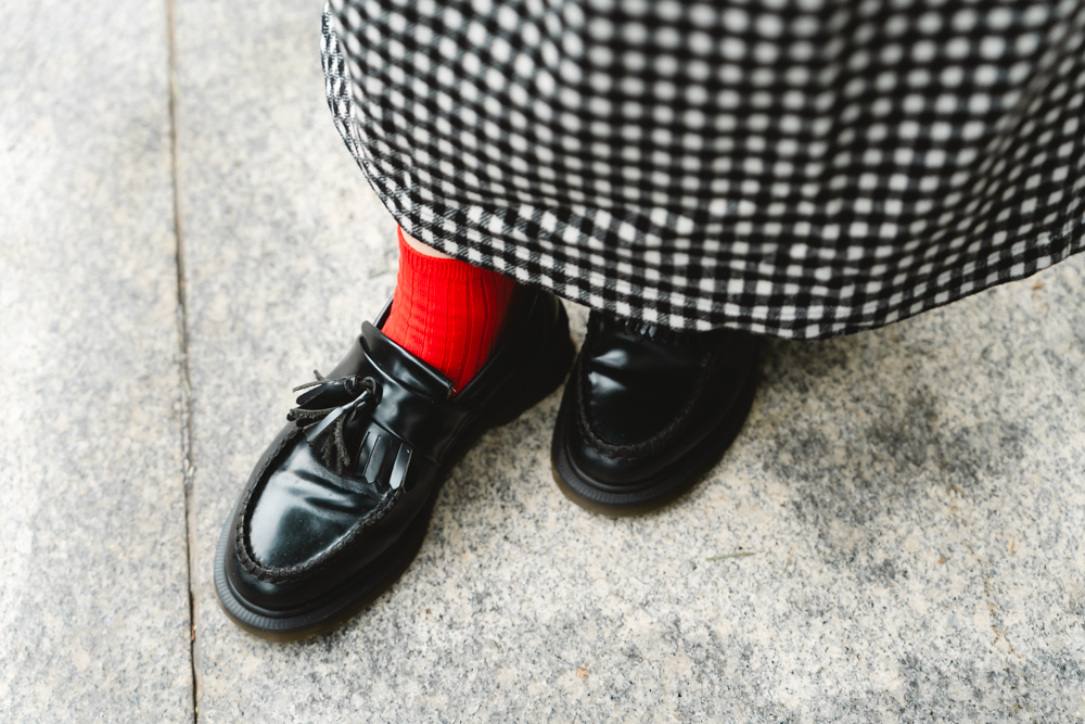 そのモノトーンの装いに鮮やかな温度感を添えるのが、インナーに選んだ《Agnes b.》の赤いカーディガン。さらに《靴下屋》のソックスにも同じ「赤」をリンクさせて、差し色に。ボトムには《GLENCH》のロング丈チェックスカートを合わせて、足元は《Dr. Martens》のローファーで英国らしいエッセンスをプラス。