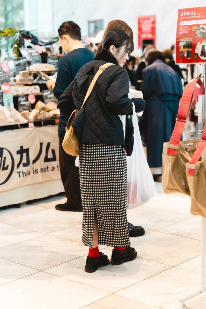 《UNITED ARROWS》の緑と白のチェックスカートは、FUDGE FRIENDの大島花菜さんの着こなしを見て手に入れたという一着。そんな憧れのアイテムを起点に、独自のミックス感覚で冬のスタイルを構成。アウターは、冷たい空気にしっくりと馴染むカーキ色の《Barbour》のジャケット。オーバーサイズ特有の無骨なシルエットが、スカートの甘さを絶妙に抑え、装いを柔らかなボーイッシュへ。ふとした瞬間に覗くジャケットの裏地が、スカートと呼応するようなチェック柄なのもポイント。