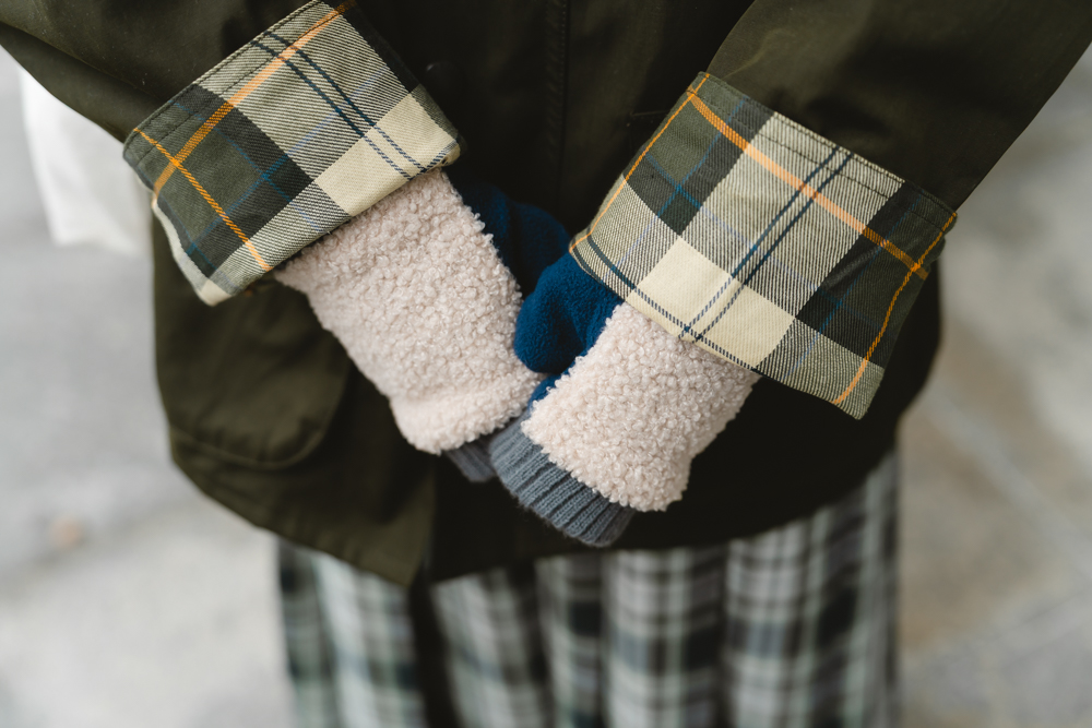 温もりのある小物使いにも注目。手元にはもこもことしたフリース素材の手袋をチョイス。タフなアウターと柔らかな質感が混ざり合い、ふんわりとした優しさが漂います。