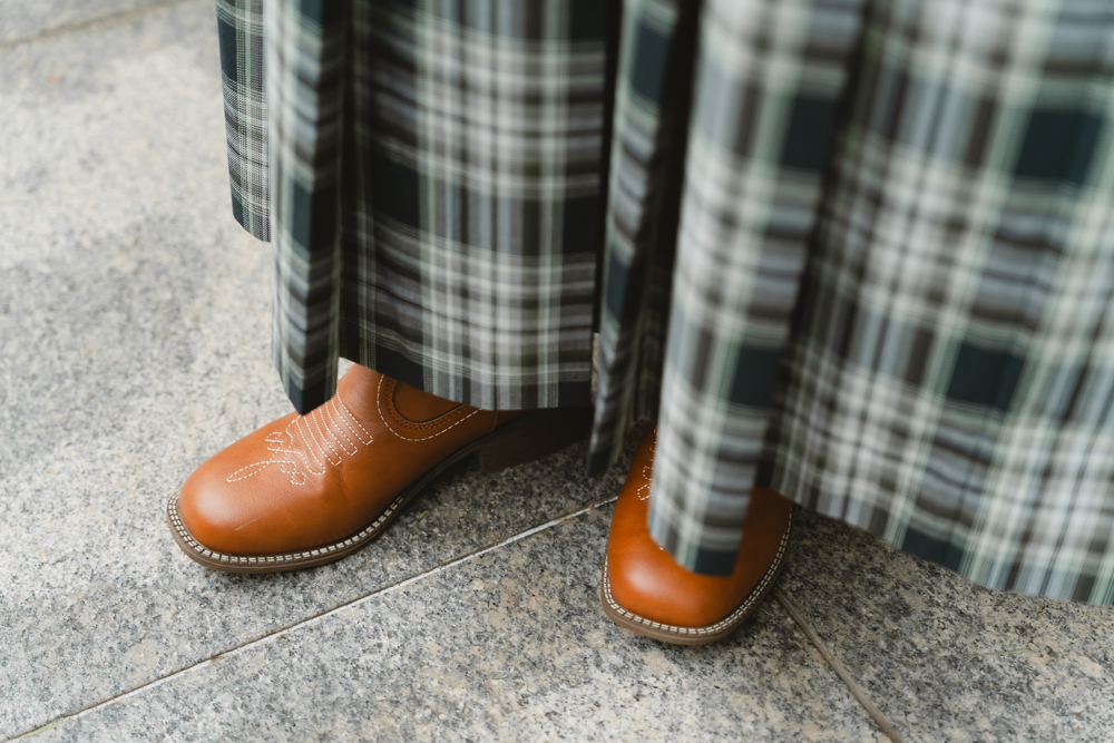 足元には、白のステッチがアクセントを放つ明るいブラウンのブーツをセレクト。ウエスタン調のディテールを感じさせる一足が、装いに程よいスパイスを加えています。憧れのスタイルを自分に似合うバランスで解釈し、こだわりを詰め込んだその着こなしには、温かな温度感が伝わってきました。