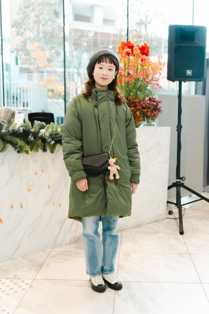 シンプルなディテールの《nagie》のカーキ色のロングダウンコートをバランスよく取り入れたサラさん。機能的でタフなミリタリーのニュアンスを持つこの一着に、彼女は古着屋で見つけたという柔らかなグレーのベレー帽をセレクト。コートのルーツに呼応するようにベレー帽を合わせ、ミリタリーなムードをあえて強調しつつも、知的な落ち着きと可愛らしさを同居させるテクニックが光ります。