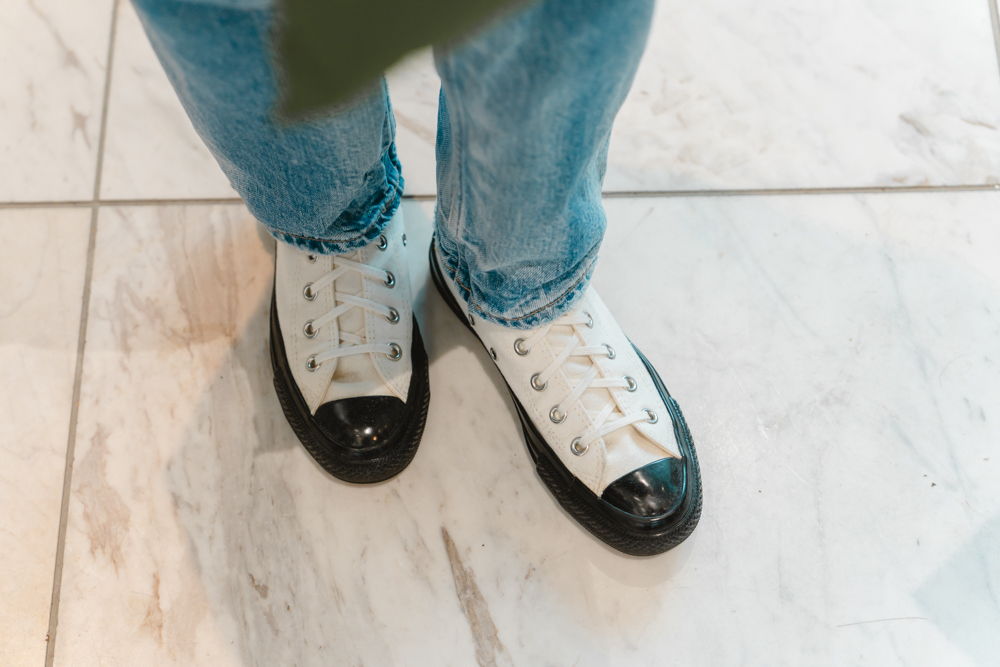 ボトムには《upper hights》の明るめなデニムを合わせ、足元はオフホワイトとブラックの《CONVERSE》でクリーンに。軽快なトーンでまとめることで、ロングコートの重厚感を感じさせない、冬の澄んだカジュアルスタイルへと着地。