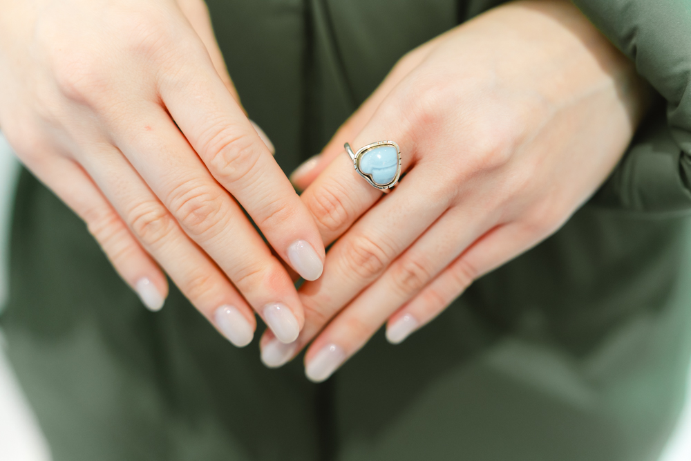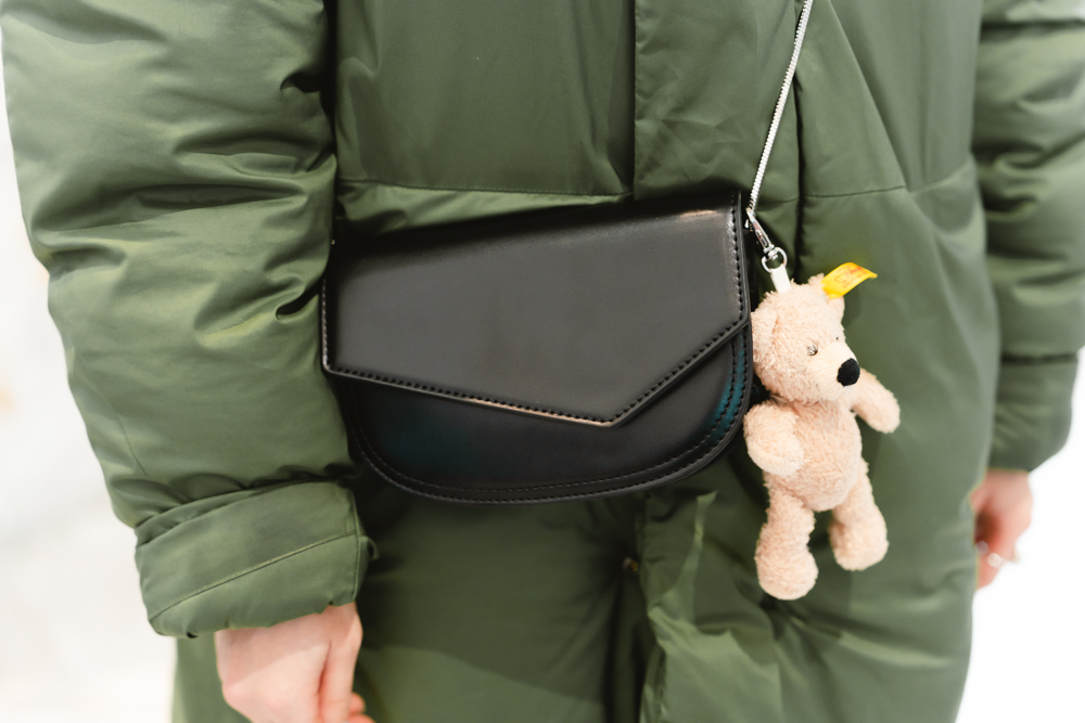 さらに視線を惹きつけるのは、随所に散りばめられた愛らしい小物です。《UNITED ARROWS》のショルダーバッグには、愛嬌たっぷりのクマのチャームを。手元には《Biju mam》の水色のハート型リングを光らせて。ネイルもシンプルながら、潤いを感じる艶感が清潔感を醸し出します。細部まで意識の行き届いたその佇まいが素敵です。