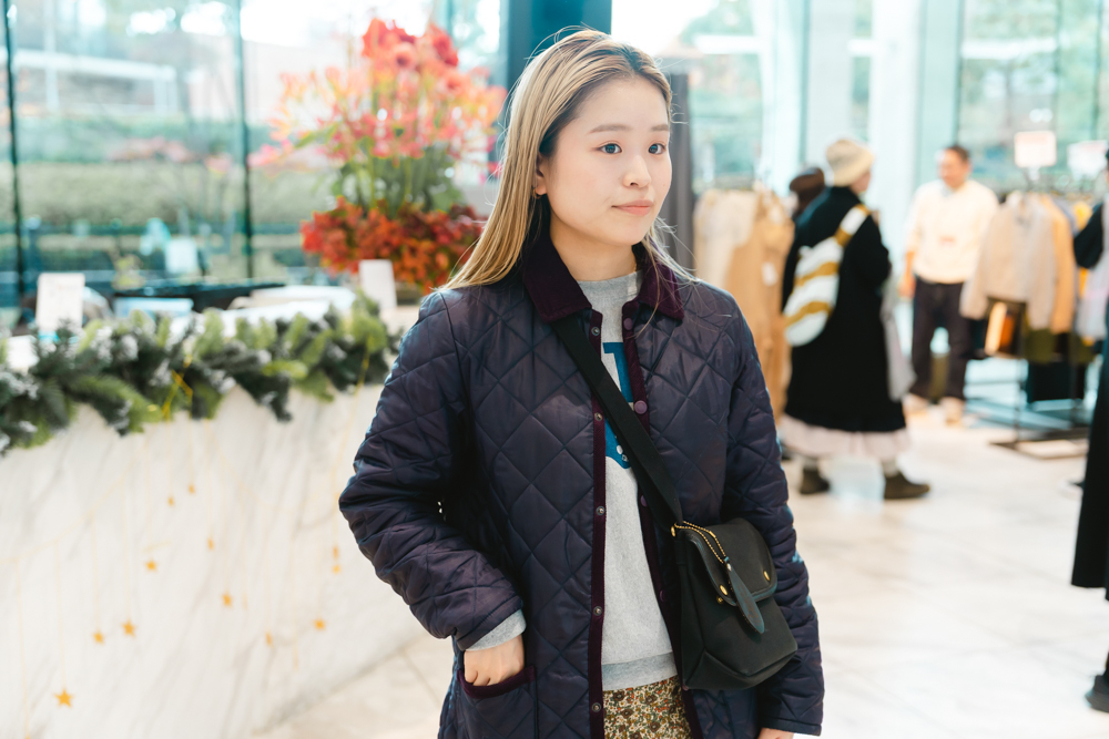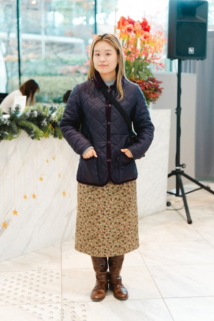 「FUDGEに載っているようなトラッドスタイルが好き」と語るNanaさん。その想いを形にするのは、《LAVENHAM》の落ち着いたトーンのキルティングジャケットと、古着屋で見つけたという可憐な小花柄が広がるスカートの組み合わせ。ひざ下丈のスカートが持つクラシカルな華やかさを、端正なジャケットと黒の《Brady》の小さなバッグで品よく引き締め。静かな気品とカジュアルさを両立させた、絶妙なバランスが目を引きます。