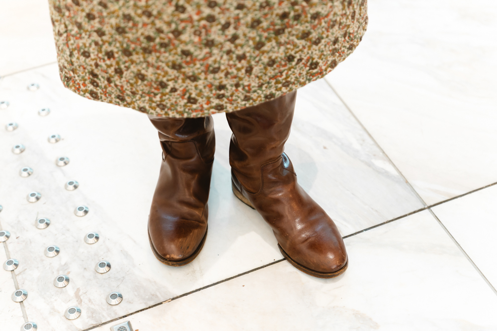 足元を彩るのは、時とともに深みを増した風合いが魅力の茶色のロングブーツ。実は、ジャケットやバッグ、そしてこのブーツも、お母様から譲り受けているものなのだそう。大切にされてきたアイテムを自身のワードローブに迎え入れ、古着のスカートと合わせて自分らしいスタイルへと昇華させています。