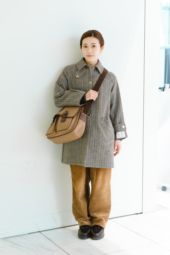 最近新調したという《Traditional Weatherwear》のステンカラーコートを着こなすあゆさん。吸湿発熱性を備えたヒートツイードの豊かな風合いと、端正なAラインシルエットが魅力的なコートです。フロントに並ぶメタルボタンが上品なアクセントとなり、「特にお気に入り」という襟元が顔まわりを聡明に引き立てます。