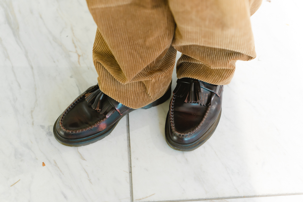 さりげない「古着ミックス」のテクニックが光る、ボトムの選択。選んだのは、古着の《BURBERRY》のコーデュロイパンツ。メンズサイズを、絞って履きこなすことで、メンズサイズ特有の太めのシルエットを活かした絶妙なボリューム感を楽しんでいます。コートのツイードとパンツのコーデュロイ、異なる質感をブラウンのトーンで繋ぐ巧みなカラー使いも、ぜひお手本にしたいポイント。さらに足元には《Dr. Martens》でトラッドな品格をプラス。