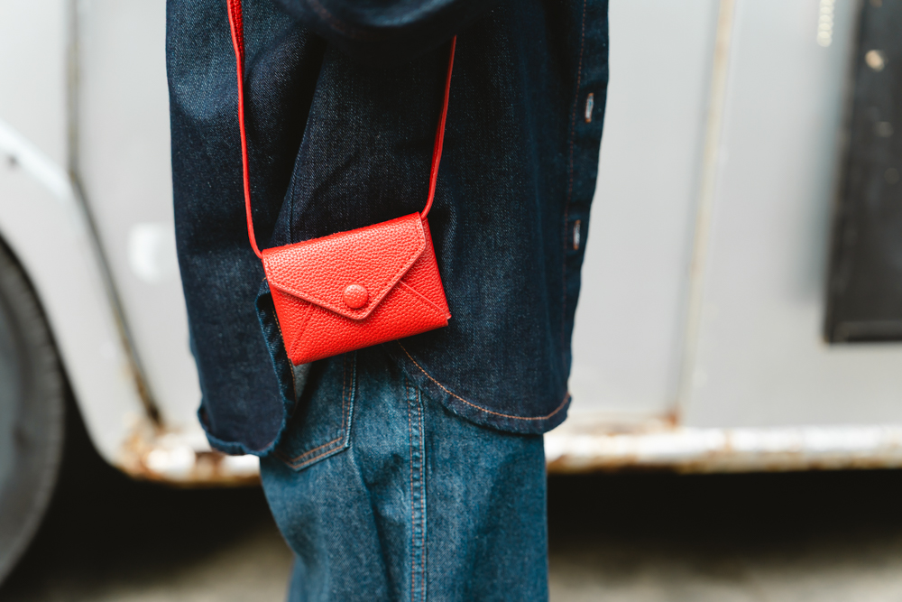 この日はクリスマスを意識して、パッと目を引く「赤」をアクセントに。《Chiina》の小さな赤いミニポーチが、落ち着いたデニムに華やかな彩りを与えます。足元を《Paraboot》の茶色のローファーで引き締めているのも、トラッドな品格を感じさせる巧みな選択です。