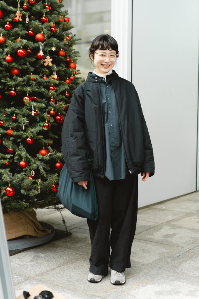 全身を《Veritecoeur》で揃え、まるでセットアップのような統一感を見せてくれたのは田中真里奈さん。黒のブルゾンに黒のワイドボトム、その間に淡い紺色のシャツを差し込むことで、似たトーンの中にもわずかな色の差異を生み出し、単調に見せない工夫が見えます。ポイントは、なんでも入りそうな《Veritecoeur》の大きな紺色のバッグ。薄手で柔らかな素材感のバッグは、中に入れる荷物の量や形によってそのつど形を変え、装いにその時々の自然な動きを与えてくれそう。