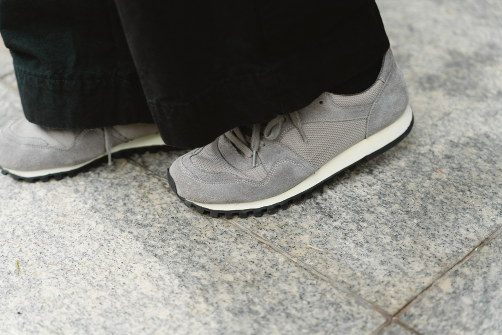 足元には《SPALWART》のグレーのスニーカーを選び、都会的な軽快さをプラスしました。厳選されたアイテムを同系色で重ねることで、シンプルながらも決して埋もれない、芯のある個性が際立ちます。