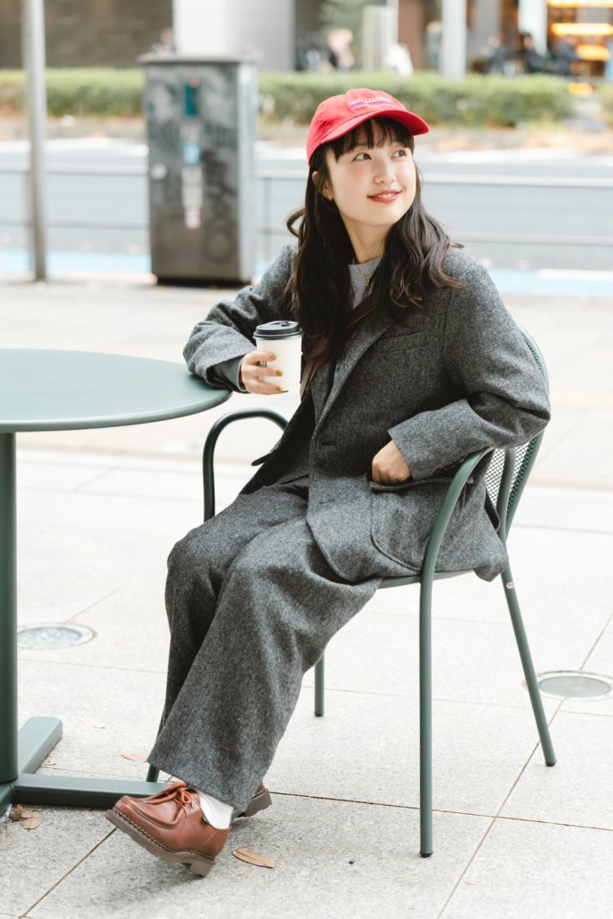 全体をグレーのワントーンで品よくまとめつつ、最高の「ハズし」になっているのが《Shinzone》の赤いキャップ。重厚なツイードの世界に、パッと目を引く鮮やかな赤を一点。このキャップひとつで、沈みがちな冬の装いに楽しげなリズムが生まれています。