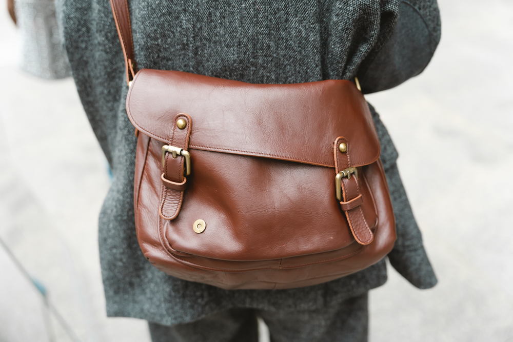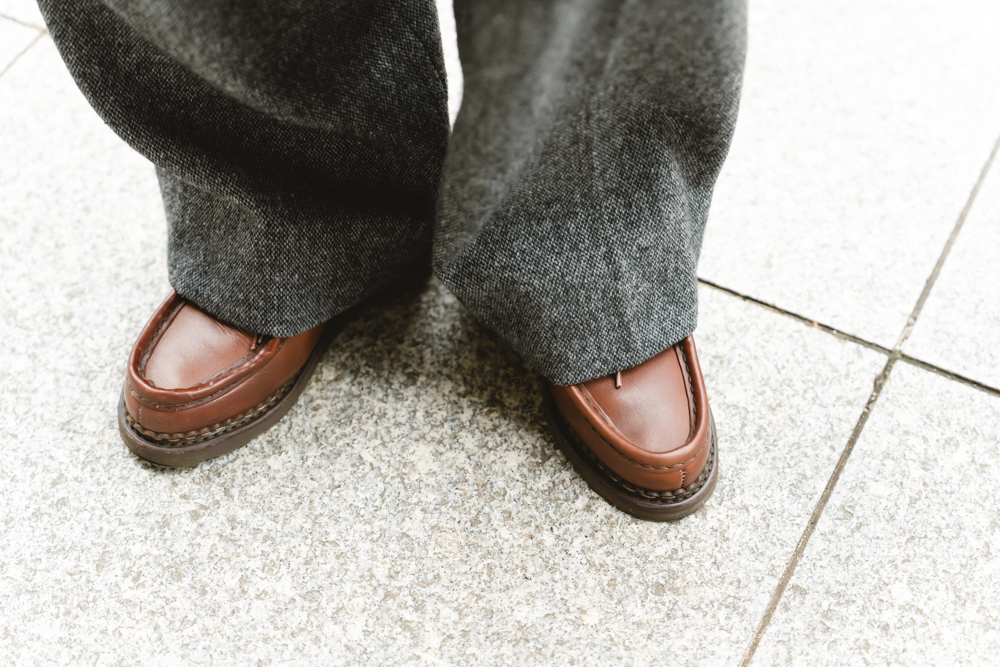 足元には《Paraboot》のチロリアンシューズを、肩にはUsedのブラウンのレザーバッグを。小物を温かみのある茶系で揃えることで、クールなグレーに奥行きと落ち着きをプラス。セットアップという完成された形を、私服らしいラフな感覚で自分流にアレンジする。そんな遊び心が伝わってくるような着こなしです。