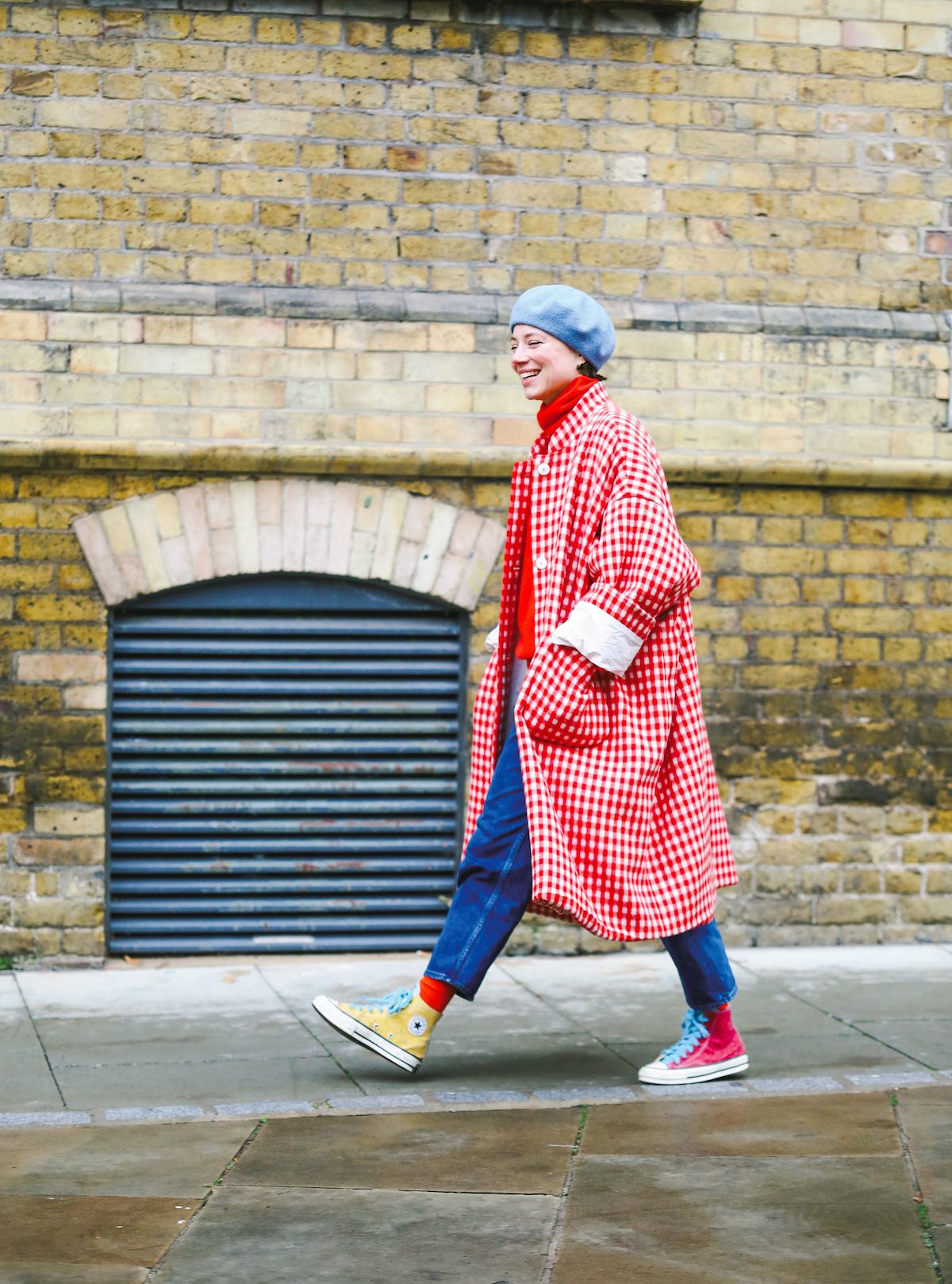 思わず目を奪われるギンガムチェックのコートが主役。セーターや靴下でコートの赤を拾ったり、あえてブルーのデニムで寒色系を加えたり、カラフルなスニーカーを投入したり、鮮やかな色のコントラストが素敵。