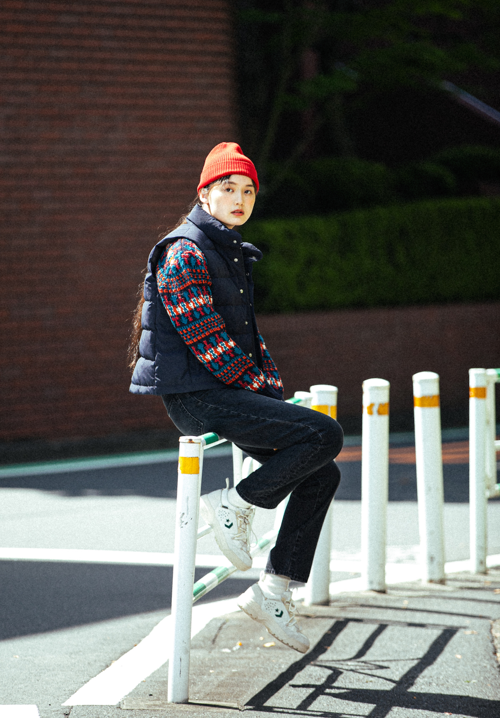 ダウンベストやブラックデニムと組み合わせて、着こなしにスパイスをプラス
