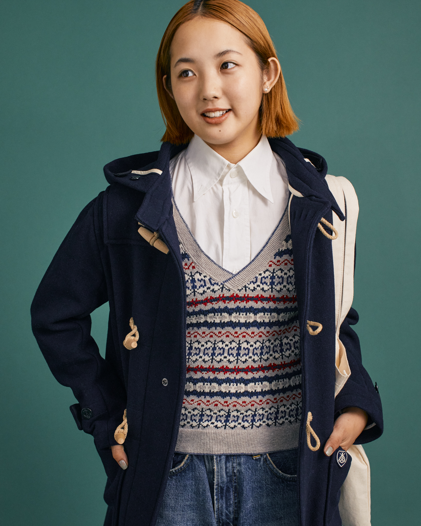 ダッフルコートとシャツのかっちりした装いに、フェアアイル柄のニットベストでプレッピーなエッセンスを投入。コンパクトなベストが、スタイルアップも叶えてくれます。