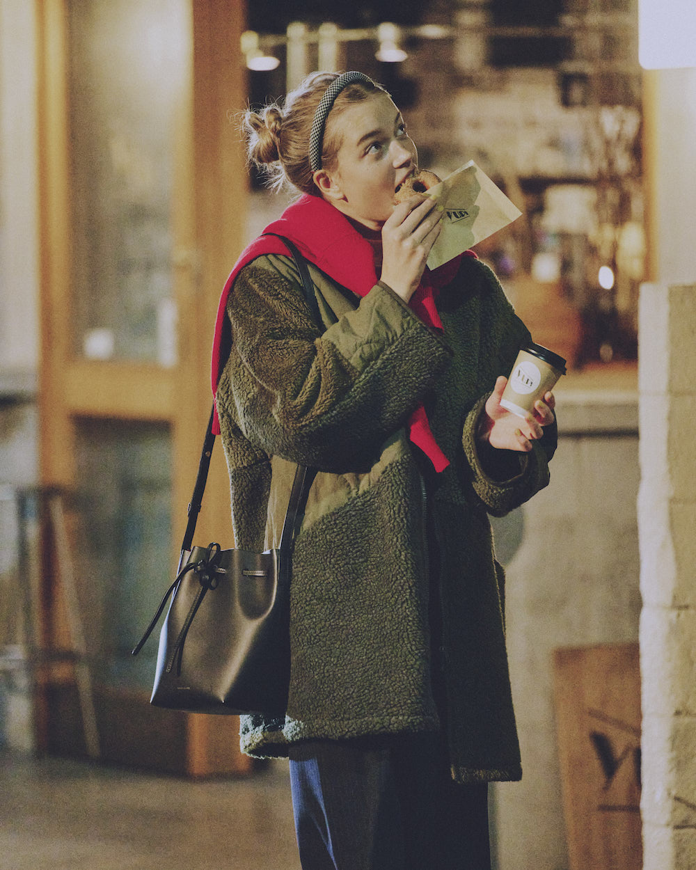 お洒落なロンドナーの中で絶賛流行中の《ワイエムシー》のコートが主役。色鮮やかなチェック柄と屈託のないメイジーの笑顔が、シックなロンドンの街を明るく彩る。