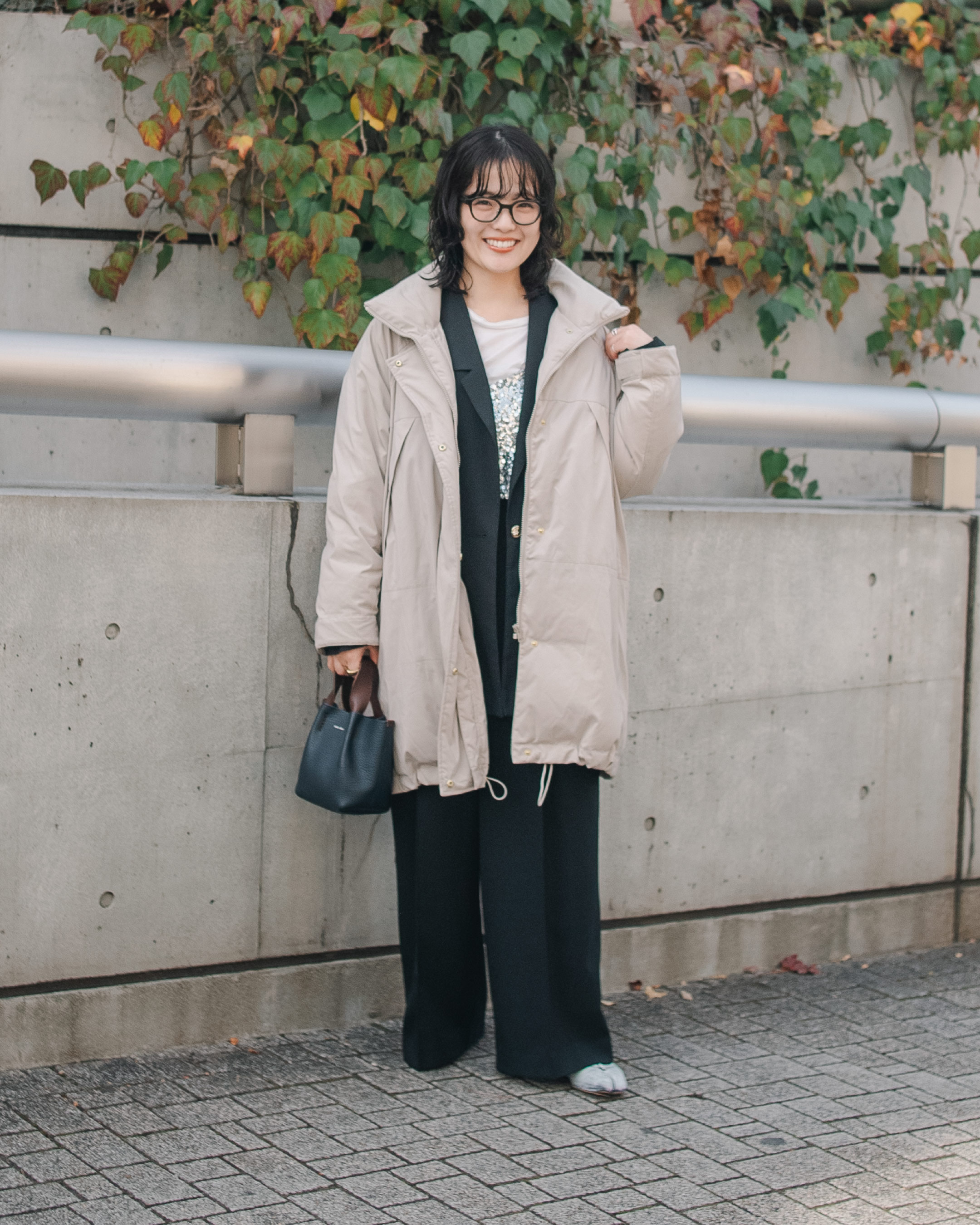 一着あると頼れるトレンチコートは、レイヤード次第で表情が変わります。インナーダウンとカーディガンを重ねることで、程よくカジュアルダウンしつつ防寒性もアップ。きちんと感とこなれ感を両立した着こなしです。