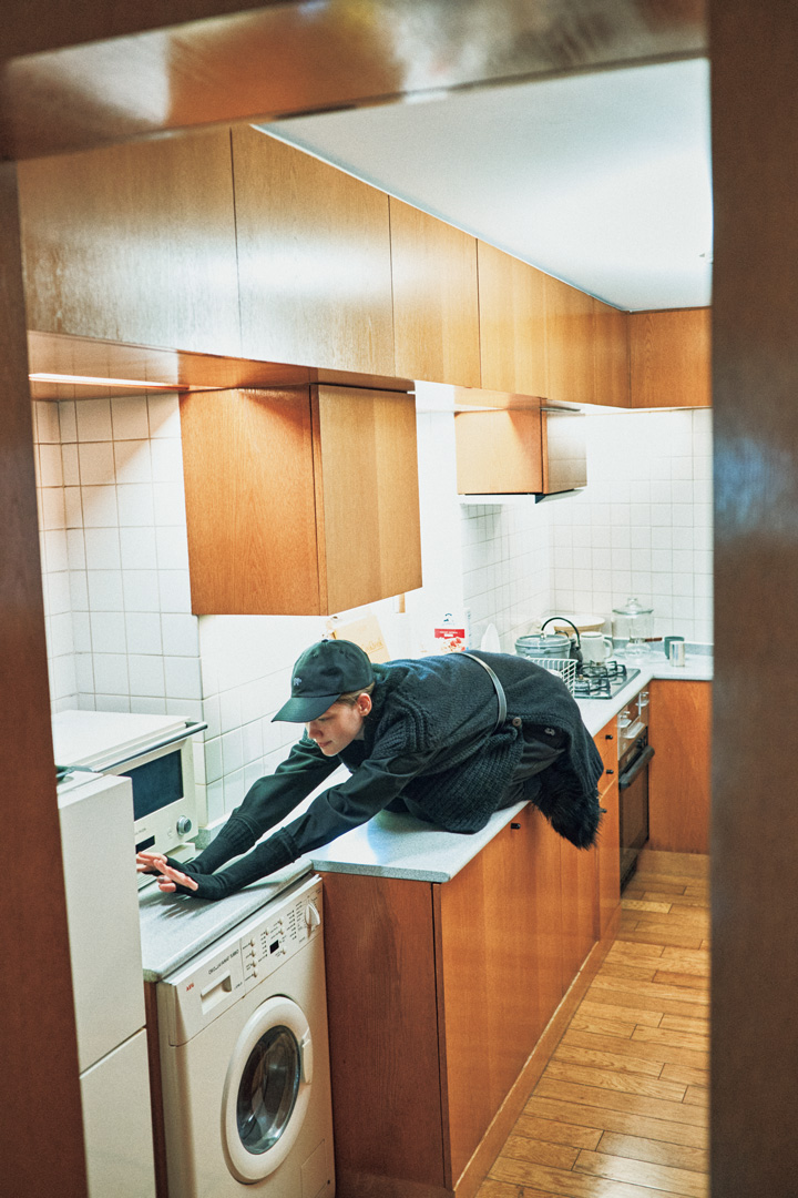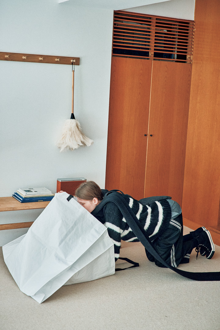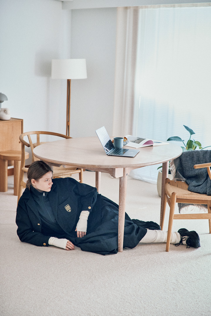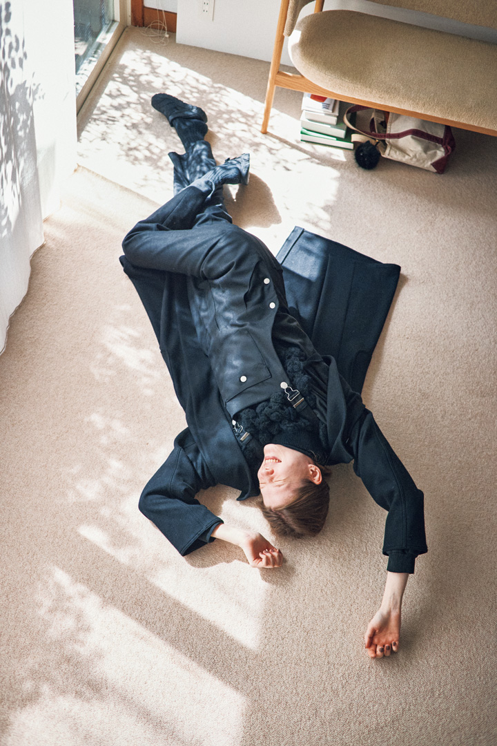コート¥110000/CONTEMPO(ヤエカ ホーム ストア)、オーバーオール¥77000/agnès b(. アニエスベー)、ニットジレ¥39600/OPEN SESAME CLUB(オープン セサミ クラブ)、カットソー¥154 0 0/UpcycleLino BASIC(ネストローブ 渋谷店)、ソックス¥2750/ROTOTO(ロトトショールーム)、シューズ¥11000/Teva(デッカーズジャパン)、ソファーの下のキーホルダー¥8910/HELEN MOORE(セムインターナショナル)