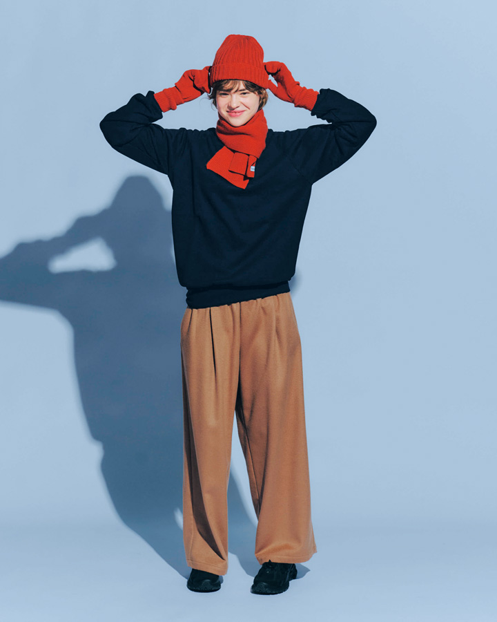 ニット帽¥14850、ストール¥40700、手袋¥14850/すべてloomer、パンツ¥121000/BODHI(以上すべてアルファ ブランド コンサルティング)、スウェットシャツ¥6050~/久米繊維(久米繊維工業)