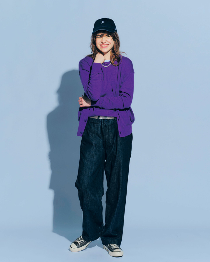 カーディガン¥40700、セーター¥66000/cash & barba(エグジステンス)、デニムパンツ[ ベルト付き]¥26180/MASTER&Co.( マッハ55リミテッド)、キャップ¥4400/’47(フォーティーセブン)、ネックレス¥22000 /CHERRY BROWN(チェリーブラウン)、スニーカー¥9900/CONVERSE(コンバースインフォメーションセンター)、Tシャツ/スタイリスト私物