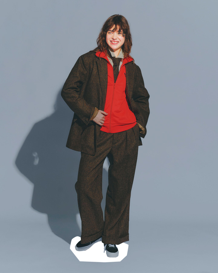 ジャケット¥77000、ネクタイ¥13200、パンツ¥50600/以上すべてts(s) ティーエスエス 代官山ストア)、トラックジャケット¥13200/adidas(アディダス コールセンター)、シャツ¥29700/nanamica(ナナミカ D.W.S.)、スニーカー¥7150/VANS(ヴァンズジャパンカスタマーサポート)