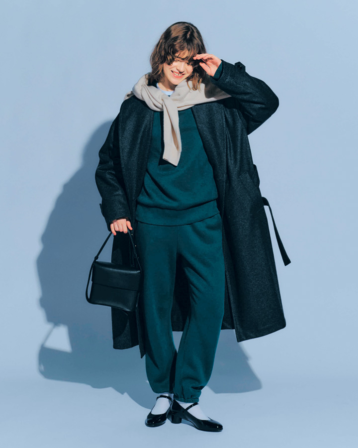 コート¥66000 /Véritécoeu(r ヴェリテクール)、スウェットシャツ¥17600、スウェットパンツ¥19800/ともにTHE SHINZONE(シンゾーン ルミネ新宿店)、肩にかけたセーター¥57200/BATONER(バトナー)、バッグ¥64900/Courtney Orla(ワングラムチャン)、シューズ¥18920/tsumori chisatoWALK(モーダ・クレア) 、その他/スタイリスト私物