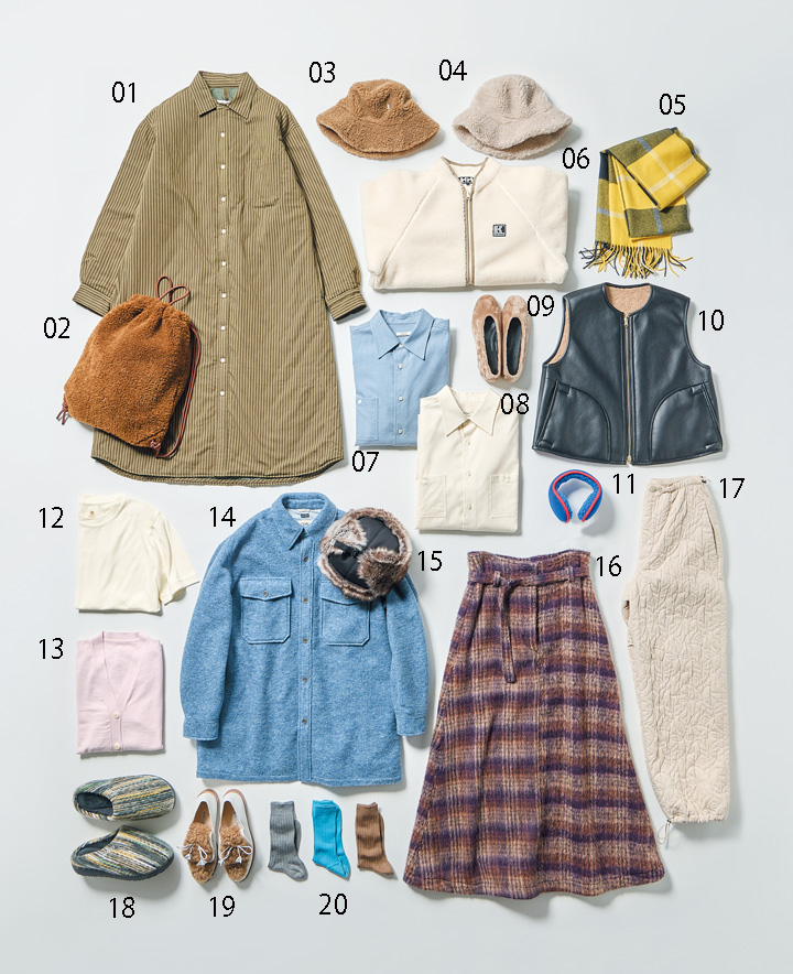 01_中綿入りでふっくらあたたかなワンピース。フルオープン仕立てだからライトアウター感覚でも楽しめる。¥69300/ts(s) ティーエスエス 代官山ストア) 02_思わず触れたくなるフラッフィーさが魅力。リュックとトートの2WAYで、ジップ付きポケット完備と、可愛いだけじゃないのもいい。[ H44×W 33cm ]¥1 7600 /MASTER&Co.( マッハ55リミテッド) 03_ウィーン発の帽子ブランドから。まるでプードルのような見た目と肌触りが愛おしい。¥38500/MUHLBAUER(ジャーナル スタンダード ラックス 表参道店) 04_防寒もかわいいも叶うウール混のボアハット。被るとたちまち、装いに季節感が漂います。¥35200/MUHLBAUER(アッシュ・ペー・フランス) 05_オリジナル素材の「ファイバーパイル」のジャケット。真冬の海で働く漁師を支えるために生まれた素材。¥24200/HELLY HANSEN(ヘリーハンセン 原宿店) 06_鮮やかなイエローが目を引くストール。軽量で寒さ知らずなカシミア仕立て。¥31900/Traditional Weatherwea(rトラディショナル ウェザーウェア 渋谷店) 07.08_カシミア100%使用。上質な起毛感と肌馴染みのよさ、軽やかな着心地は感動もの。各¥110000/BODHI( アルファ ブランド コンサルティング) 09_ミニマルなデザインながら存在感は抜群。絨毯のような滑らかな毛足が足元にあたたかさをもたらす。¥39600/FABIO RUSCONI( プライムビアンカ) 10_レザー調のベストはリバーシブルで、内側はエコファー素材。¥27500/Traditional Weatherwear(トラディショナル ウェザーウェア 渋谷店) 11_ふかふかのボアが耳を優しく包み込む。鮮やかな配色は装いのアクセントに。¥4950/FreshService(フレッシュサービス ヘッドクオーターズ) 12_世界最高ランクの超極細メリノウールのみでつくられた上質なTシャツ。繊維が極めて細く、肌触りはかなりなめらか。ウール独特のチクチク感がなく、素肌に着ても心地いい。一度纏えば、Tシャツの概念が覆ること間違いなし。¥44000、13_カーディガンもウルトラファインメリノウール100%仕立て。薄手ながらあたたかさはバッチリ。絶妙なハリとツヤが品のよい着こなしを叶えます。¥49500/ともにNIKKE1896(ニッケイチハチキュウロク) 14〈ゴアテックス〉社の防風透湿素材「ウィンドストッパー」を採用。お洒落な見た目ながら寒風を完全シャットアウト。¥56100/nanamica(ナナミカ D.W.S.) 15_ふわふわのエコファーが印象的なフライトキャップ。ナイロン部分ははっ水加工付きだから、ウィンタースポーツのお供にも。¥7700/OVERRIDE(オーバーライド 神宮前) 16_季節感たっぷりなシャギー素材のスカート。ふわりと広がるボリューミーなAラインシルエットが、女性らしさを引き立てる。¥57200/Y.M.Walts(マービン&ソンズ) 17_軍もの由来の耐久性と保温性を残しつつ、無骨さを感じさせないスタイリッシュなデザインが新鮮。同素材のアウターとセットアップで楽しむのもいいね。¥49500/JöICEADDED(ジョイスアディット) 18_セーターのような編み模様が目を引く《スブ》の新モデル。履いた瞬間のあたたかさは格別。¥9900/SUBU(マッハ55リミテッド) 19_足入れのよい、しっとりやわらかなレザーが特徴のチロリアンシューズ。リアルムートンならではの豊かな表情を楽しんで。¥83600/NEBULONI E.( ネブローニ) 20_グレーとブラウンは、定番の「8×2リブソックス」。つま先のシームレスデザインと、エジプトコットンならではの滑らかな肌触りが魅力。ブルーは、「5×3リブウールソックス」。あたたかさと通気性を兼ね備えたスパーファインメリノウールの糸を採用。各¥3630/PANTHERELLA(真下商事)