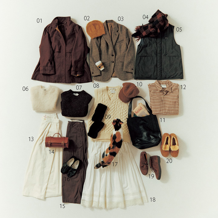 01_Aラインシルエットのジャケットコート。重ね着の上からもサッと羽織れるライトな着心地。¥16995/FREAK’SSTORE(フリークス ストア渋谷) 02_日本のストールブランドがつくるニット帽は、モヘヤシルク素材のほわほわとした毛並みが心地いい。¥13200/ASAUCE MELER(アイネックス) 03_装いをクラシカルに導くヘリンボーンジャケット。¥86900/ANATOMICA(アナトミカ 東京) 04_太番手のウールを用いたマフラー。大ぶりのブロックチェックが首元のアクセントに。¥24970/MHL.( エムエイチエル.) 05_レイヤードに重宝するナイロンべスト。さりげないロゴがGOOD。¥46200/A.P.C.( アー・ペー・セー カスタマーサービス) 06_子ネコの毛みたいにしなやかなシャギーセーター。ネックやリブもやわらかい。¥41800/BATONER(バトナー) 07_弾力のある英国羊毛を使用したセーターは、無染色ならではの自然な風合いが魅力。¥45980/MHL.( エムエイチエル.) 08_スタイリングを立体的に仕上げるアラン模様のベスト。Vネックから何を覗かせる? ¥29700/PEREGRINE(真下商事) 09_ネコのポーみたいに愛らしいアームウォーマー。サムホール付き。¥24200/FUMIE TANAKA(ドール) 10_《ニューエラ》のボアキャップは、オーセンティックな形をベースにしていて、頭にすんなり馴染む。¥4950/NewEra®︎(ニューエラ) 11_《アナトミカ》×《テンベア》の別注バッグはネコも入れるサイズ感。型崩れしにくいゴートレザーを採用。[H39×W24.5×D13cm]¥69300/ANATOMICA by TEMBEA (アナトミカ 東京) 12_襟チラ、袖チラ、裾チラにも活躍してくれるギンガムチェックシャツ。¥33000/YAECA(ヤエカ アパートメント ストア)13_タック入りのワイドパンツは、快適さを追求するフレンチブランドから。¥62700/GALLEGO DESPORTES(シップス インフォメーションセンター) 14_「バレル」、「シリンダー」、「チューブ」などさまざまなニックネームを持つユニークなバッグ。[H12×W26×D12cm]¥47300/CAMBRIDGE SATCHEL(マッハ55リミテッド) 15_ブラウンのパンツは、黒よりもやさしく着こなしを引き締めてくれる。¥16940/BEAMS BOY(ビームス ボーイ 原宿)16_ネコも気になるピカピカのローファー。足元で存在感をバッチリ発揮。¥68200/Repetto(ルック ブティック事業部) 17_三毛猫のきゅっきゅ♡。背中にハートの模様が隠れているシャイな女の子。お尻をぽんぽんされるのが好き。(@qyuqqyu) 18_ドラマチックに広がる、ギャザーたっぷりのレーススカート。¥39600/Bilitis dix-sept ans(ビリティス) 19_英国生まれのチャッカブーツは、上品でいて肉厚なスエードが自慢。¥62700/SANDERS(サンダース ジャパン) 20_もこもこが溢れ出るブーツは、ネコも羨むあたたたかさ。¥18700/L.L.Bean(エル・エル・ビーン カスタマーサービスセンター)