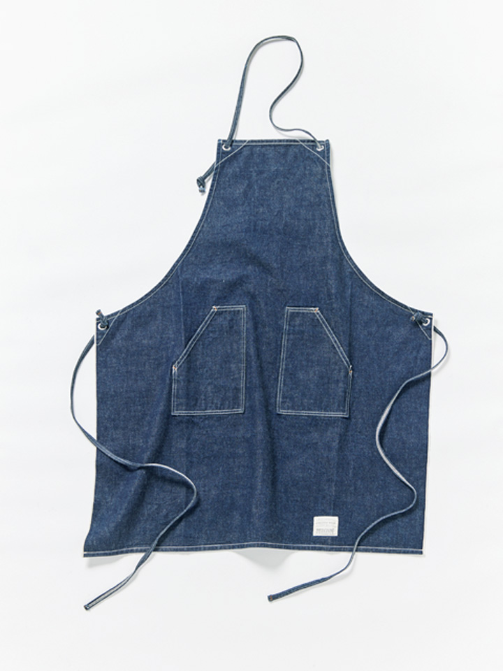 13.7oz のジンバブエコットンデニムを使用したエプロンは、育てがい抜群。両サイドに耳をあしらい、左裾にはオリジナルネームのパッチをつけたりと、ミニマルながらキャッチーな仕上がり。