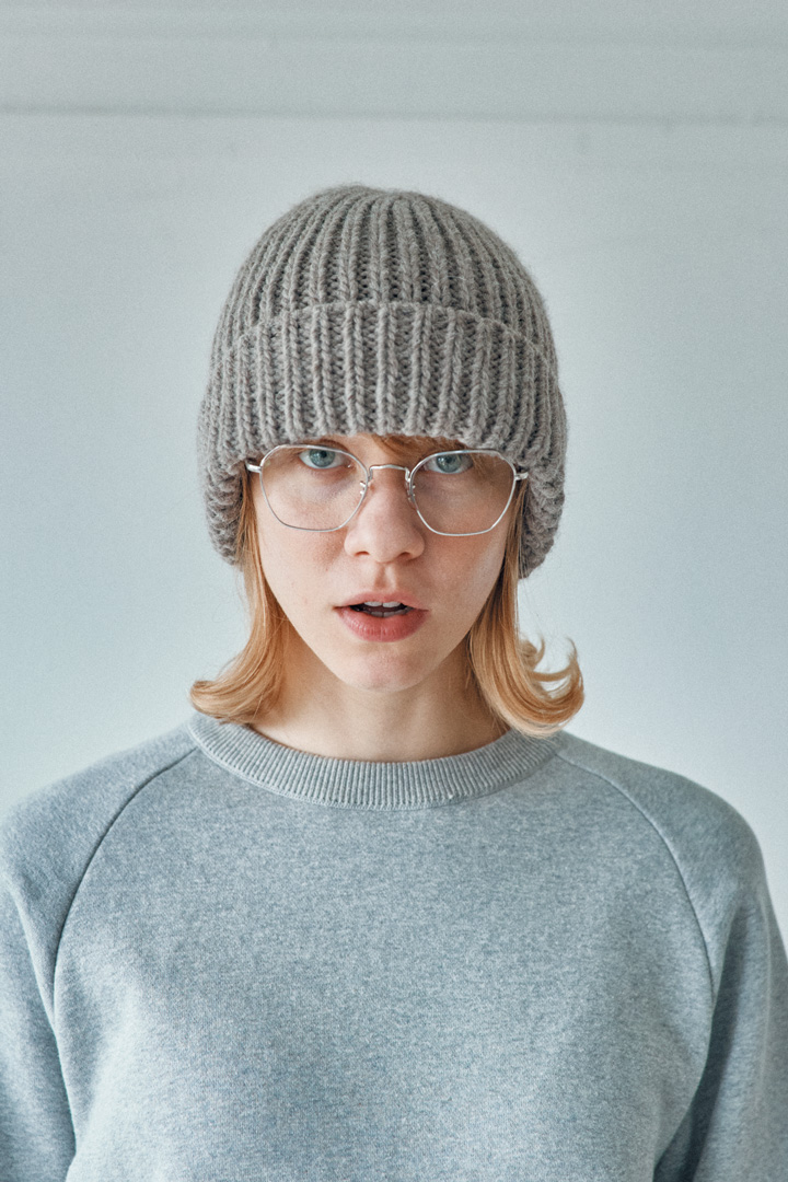 ニット帽¥5500(ビューカリック&フロリック)、メガネ¥50380 / Oliver Peoples(ルックスオティカジャパン カスタマーサービス)