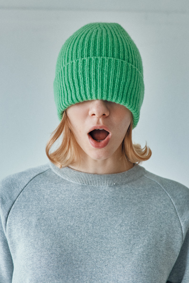 スコットランドのニットアクセサリーブランドからミニマムなニットビーニーを。キャッチーなカラーを備えておくと、スタイリングのアレンジに重宝する。