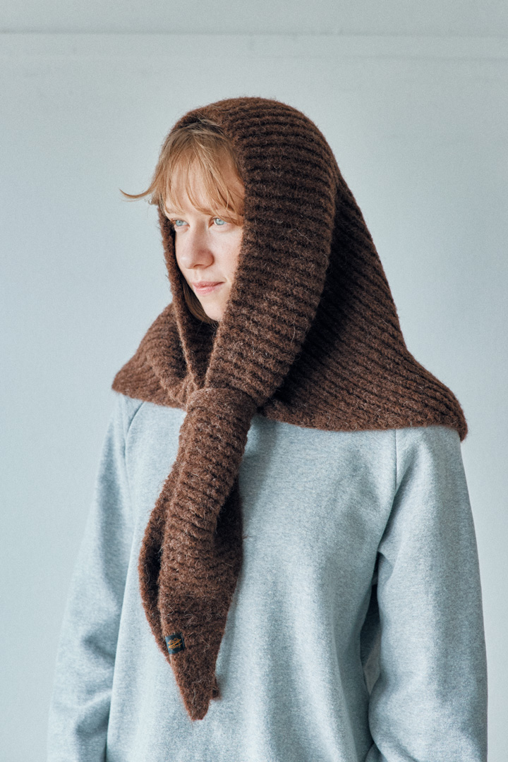 大判の三角ニットストールのぬくもりにもうメロメロ。頭からすっぽり被ったり、首に巻きつけたりと、自由な発想で楽しめる。冬の醍醐味だね。