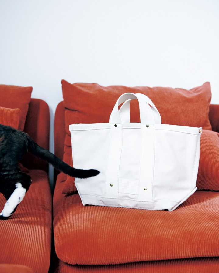 「レイルマンバッグ」は、1940 年代にアメリカの鉄道員が持っていたバッグから着想を得てデザインされたもの。重い物を運ぶ前提だから頑丈で持ち手は短め、生地のキャンバスははっ水性があって、ガシガシ使えるのが嬉しいね。ムウムが引っ掻いてもへっちゃらです。