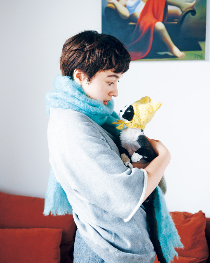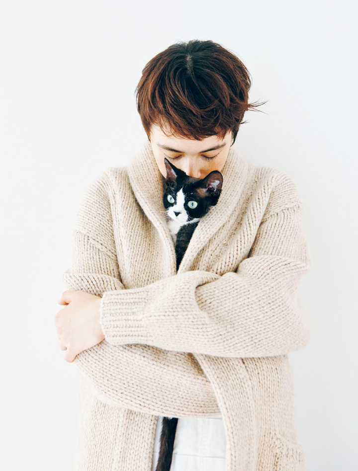 ムウムはお洋服にくるまるのが大好きで、特に冬はセーターの中に潜り込んで眠りこけています。今日のお目当ては「ハンド ニット ガウン」。職人が少し粗目の糸を5 本どりして、極太の棒針で手編みすることで、ざっくりとした表情に。サッと羽織るだけでも存在感がたっぷりです。ウール100% によるあたたかい着心地に、ニコさんもムウムも虜になっているみたい。