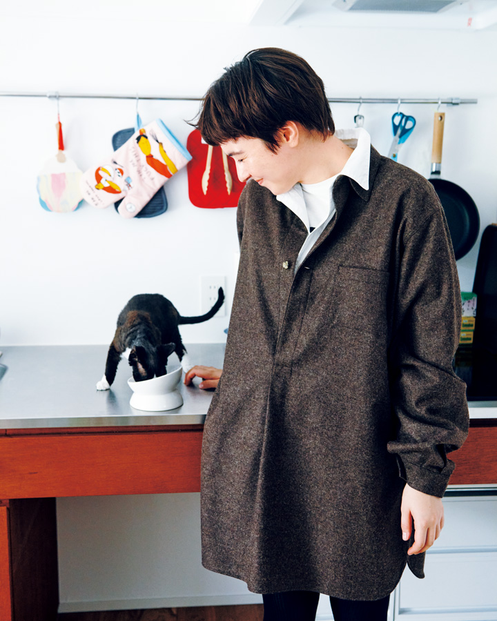 ニコさんは早起きです。ニコさんが起きると、ムウムも起きてきて、一緒に朝ごはんを食べるのが日課。今日はとびきりお腹が空いているムウム。おやつももらってご満悦。それを見守るニコさんは、軽くてやわらかくてあたたかいフランネル素材のロングシャツをワンピース風に着こなします。中にT シャツを着たり、白シャツを重ねたり、工夫を凝らした印象的な装いが素敵です。