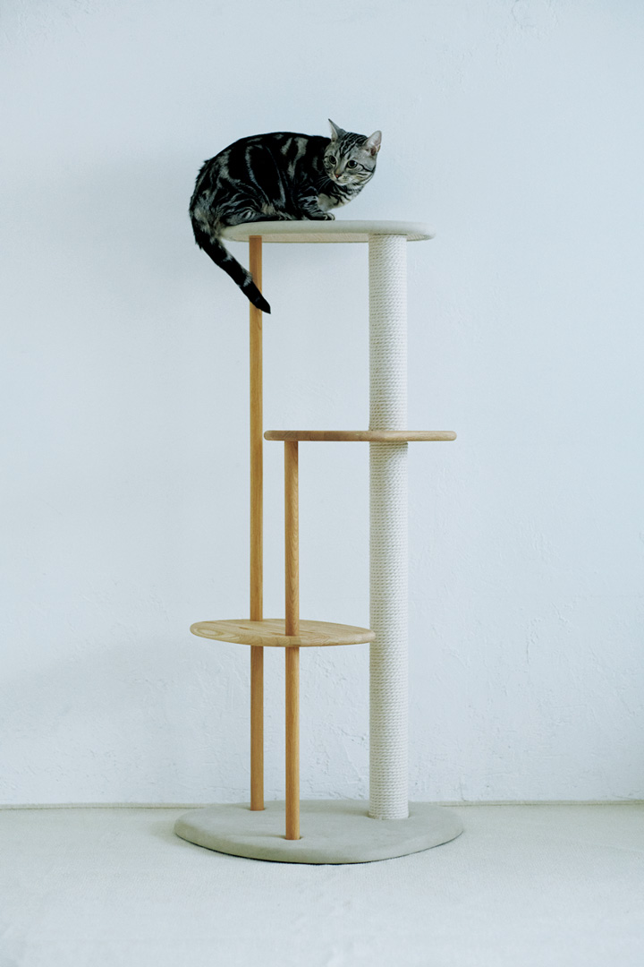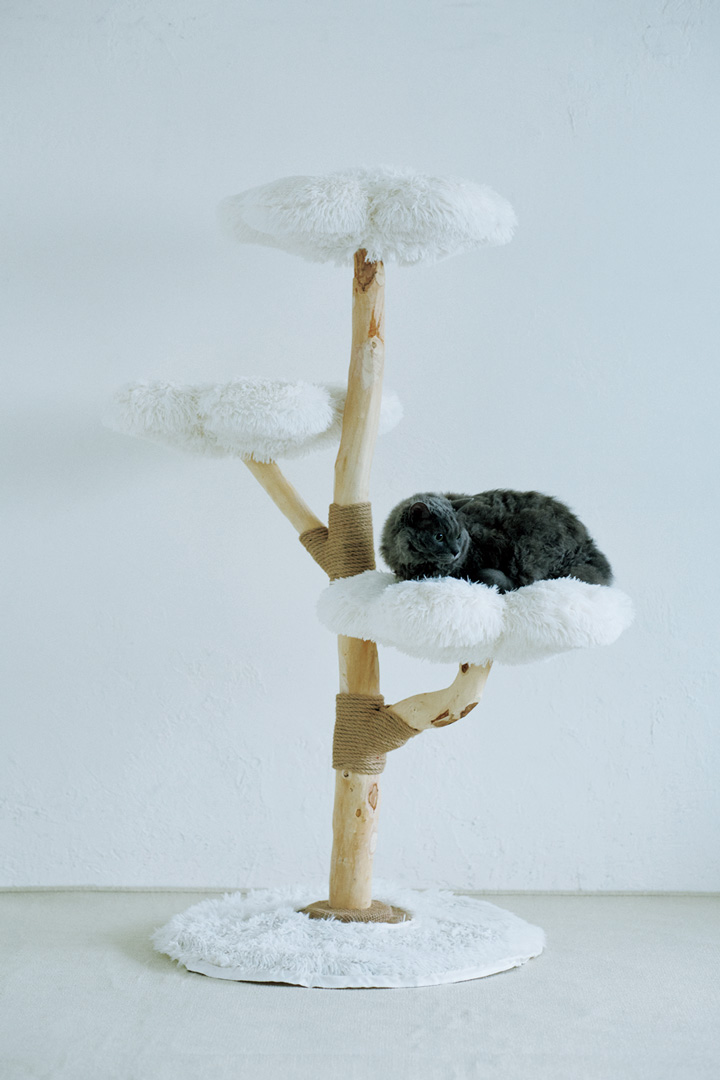 まるで木の上に浮かぶ雲のよう。無垢材を使い、ネコのライフスタイルに寄り添って設計されたキャットタワー「雲にのる」。3 つ用意された雲型のベッドはからだにやさしくフィットし、沈み込む設計。就寝時のストレスを軽減し、心地よい眠りをサポートしてくれる。
