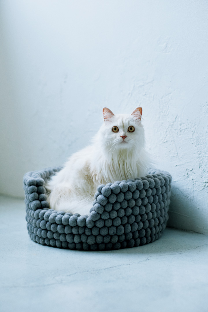 ウールボールをひとつずつつなぎ合わせ、ハンドメイドで仕上げたラウンド型のベッド。丸くなって眠るのにちょうどいい深さと形で、包まれるような安心感を与えます。ウールならではのぬくもりとやわらかな質感が、ネコさんの癒しはもちろん、インテリアにもあたたかみを添えてくれる。