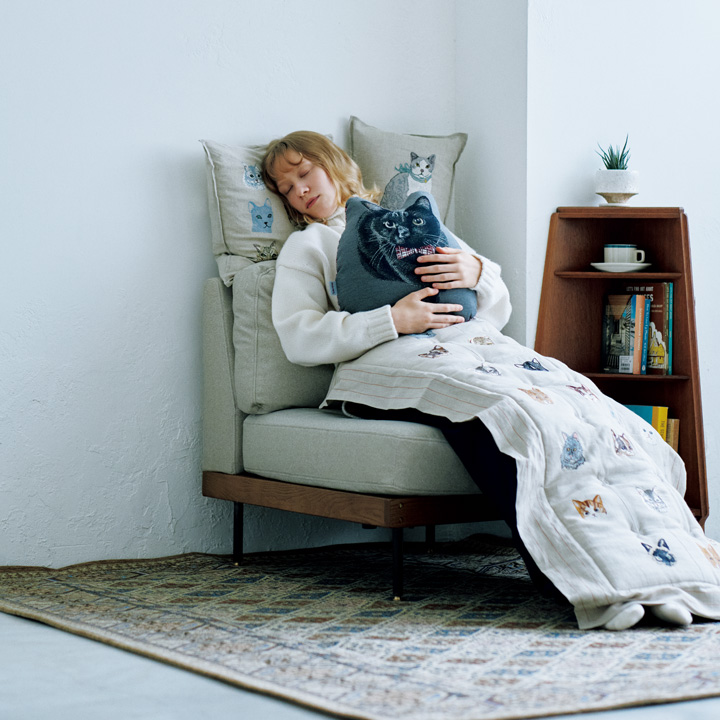 JOURNAL STANDARD FURNITURE _ネコさんはなぜ、飼い主の目を見ながらソファで爪をとぐのでしょう? お気に入りのソファが目の前でバリバリと音を立てて傷んでいく姿よりも、愛猫の満足を取ってしまうわたしたち。そこに爪とぎがあるのに…… 。そんなジレンマとももうおさらばです。世の中にはネコさんの爪が引っかかりにくいファブリック「スクラッチフリー」を用いた、素敵なソファがあるのですから!ソファ「LILLESOFA 1P 25AW Fabric」[ H72×W67.5×D 81.5×SH 38 cm ]¥69300 ACMEFurniture _毛足が短く、総柄なので汚れが目立ちにくく、ネコさんの毛が侵入しにくい目の詰まったラグもおすすめ。手洗い可能でいつでも清潔を目指せます。ラグマット[160 ×119 cm ]¥17600(ともにジャーナルスタンダード ファニチャー渋谷店)Coral & Tusk _ ニューヨーク生まれの《コーラル&タスク》のネコモチーフは、クッション、スロー、ぬいぐるみ、ポーチ、ティッシュボックスカバーなど多岐にわたる。クッションカバー(左)[ H40× W40 c m ]¥25300、(右)[ H40×W30 cm ]¥24200、キルト[ H127× W81cm ]¥134200(アッシュ・ペー・フランス) HUGPET _ 日本最大の毛織物産地、愛知・尾州で60年の歴史を重ねた〈サン・オリオン〉が提供する〈ハグペット〉は、独自技術「フォトジャガード」を用いてペットの写真を織物に再現。複雑な色合いや立体感をもつ唯一無二のクッションを提供している。サイズ、背景色、裏生地、名入れなど、多数のオプションを用意。クッション[ H34 ×W32 × D16 cm]¥20900(ハグペット)model _セーター¥39600 / SLOANE(ザ ショップ スローン 新静岡セノバ店)、スウェットパンツ¥27500 / Champion(ヘインズブランズ ジャパン カスタマーセンター)、ソックス/スタイリスト私物