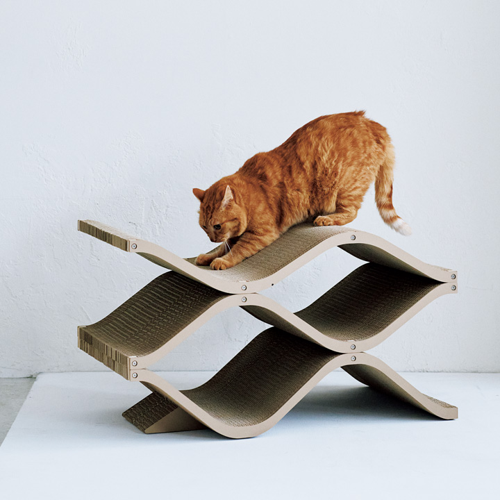 ネコさんが立ったり伸びたりしながら爪とぎができるスタンド。市販の爪とぎボードを差し込むだけの手軽さも魅力。