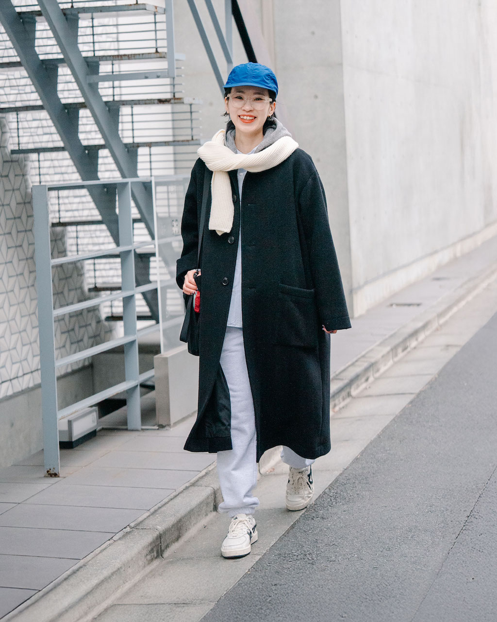 グレーのワントーンコーデに黒コートを羽織ったボーイッシュな組み合わせは、抜け感のある白マフラーで軽やかな印象に。爽やかな青のキャップでよりクリーンな雰囲気を演出。