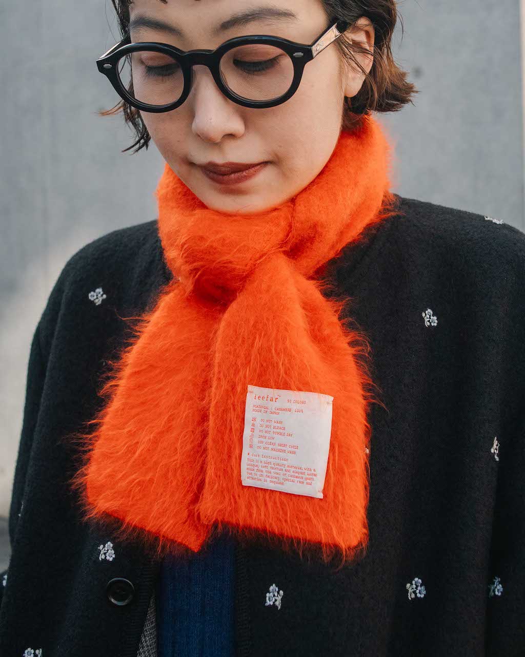 ▶︎コートとジャケットの重ね着の上級者、オレンジのマフラーや星型のブローチなど小物遣いもかわいい